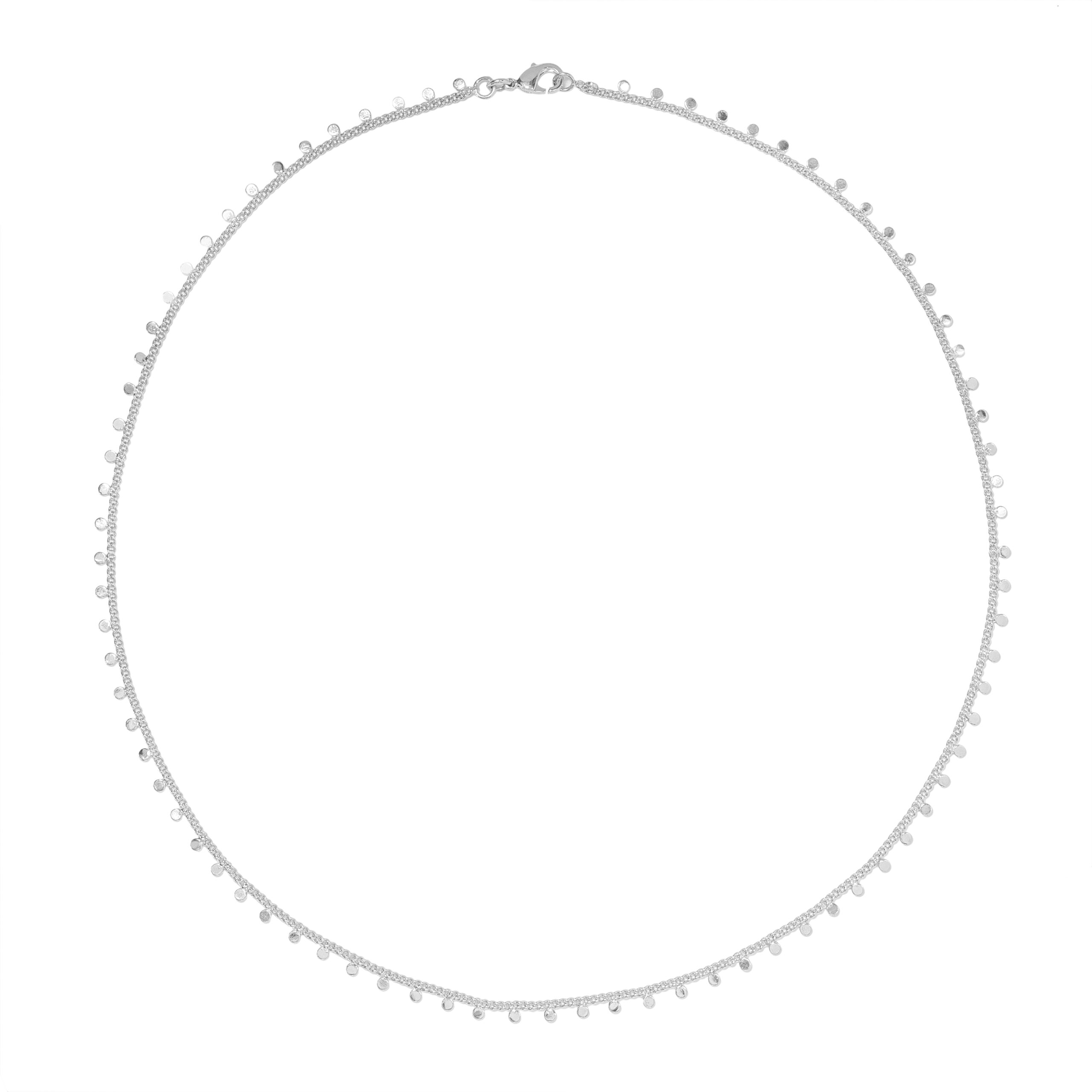 Um colar delicado com plaquinhas penduradas dá um toque de jovialidade ao visual. A peça é com banho de ródio, leve e casual.